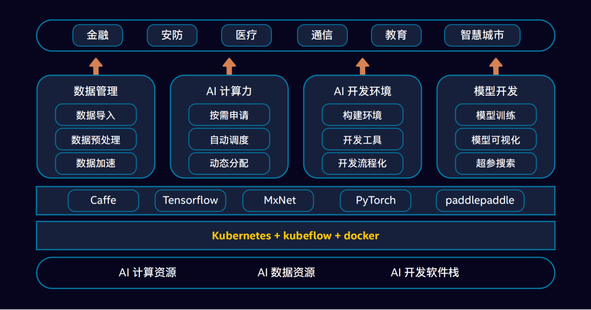 作为云原生的核心技术, Kubernetes 能够管理云平台中多个主机上的容器化应用,能够完成 AI 资源的统一部署、规划、更新、维护,有效提高 AI 资源管理率。此外,在基于 Kubernetes 的 AI 开发平台建设实践中,使用 CPU 服务器可有效利用空置资源、空闲时间,并通过 Kubernetes 的弹性资源调度分配给其它应用。而且 CPU 作为通用算力提供者,在采购成本、使用难度等方面有着重要优势,不仅支持 AI 运算,还可用于其他应用负载。