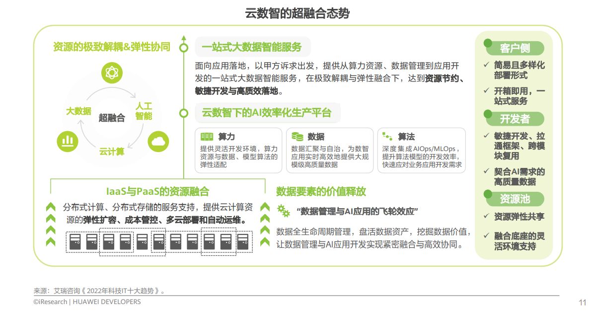 在大数据领域,云数智融合发展,带来云资源、数据资源和AI能力的极致解耦与弹性协同,使得底层云资源调配更加灵活弹性,数据层AI应用更加高效,开发层开发体验更加敏捷。三方面融合,为开发者提供从开发到部署、端到端的一站式大数据智能服务,达到资源节约、敏捷开发与高效落地。