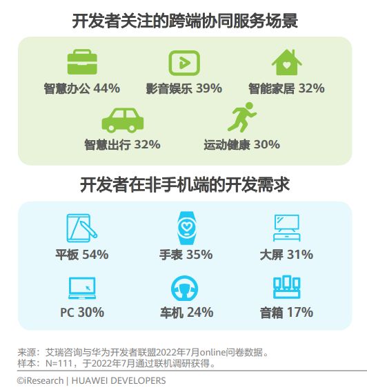 根据开发者调研数据,开发者对智慧办公和影音娱乐场景的跨端物联需求相对关注,由此也带动了平板、大屏等跨端开发需求。而包括智能家居和智慧出行场景的关注度也有30%以上,且其相关硬件(车机、智能音箱)目前处于渗透率高速提升阶段,可以预见未来硬件和应用的协同共振作用将更为明显。