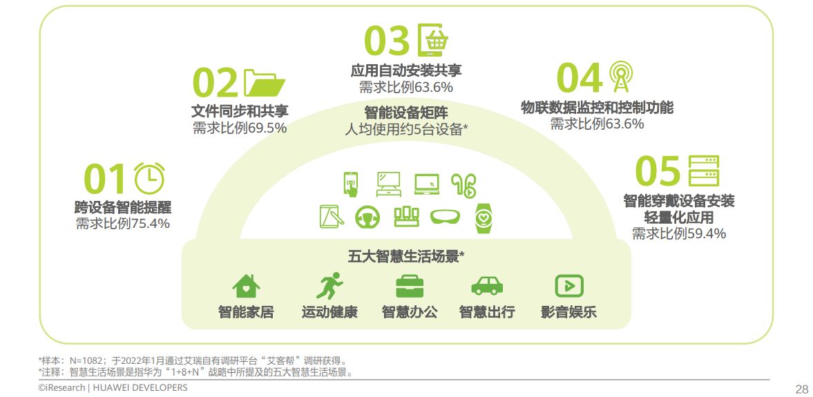 目前及未来3-5年内,以手机为核心的一超多强的硬件矩阵将会是智能终端的主要格局。根据用户调研数据显示,用户目前平均拥有近5台智能设备。随着智能设备不断深入各大生活场景,用户对跨设备的智能互联有了新的要求,以智能提醒、文件同步、应用共享、物联数据打通及在智能穿戴设备上安装轻量化应用,用户均有较高的需求(60%及以上),未来开发者不仅需要关注手机这一终端的体验,更需要关注多终端之间信息流转、同步的体验,为用户打造多端统一的互联智慧体验。