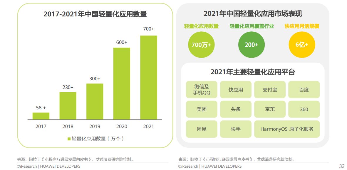 轻量化应用中,国内主流硬件厂商推出的快应用表现不俗,根据开发者调研数据,超过90%的开发者知道快应用,近4成开发者已经进行快应用开发,相比2020年调研分别上升5。1%和12。2%。截至2022年Q2,快应用联盟在网用户超过11亿,月活规模超过6亿,已经具备广泛用户基础。