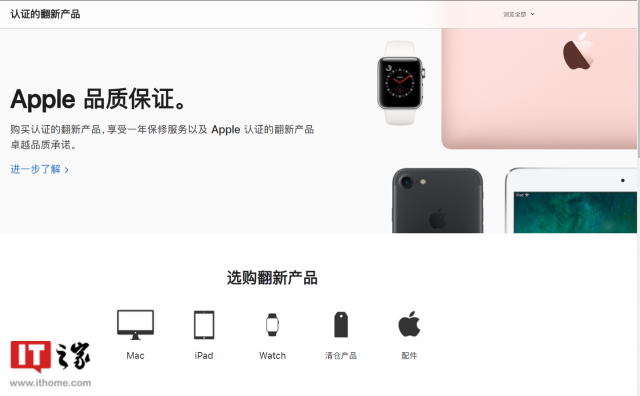 据苹果翻新产品网站显示,购买认证的翻新产品,享受一年保修服务以及 Apple 认证的翻新产品卓越品质承诺。目前翻新产品包括 Mac、iPad、Apple Watch、清仓产品、配件等。但仍然缺乏 iPhone 产品。
