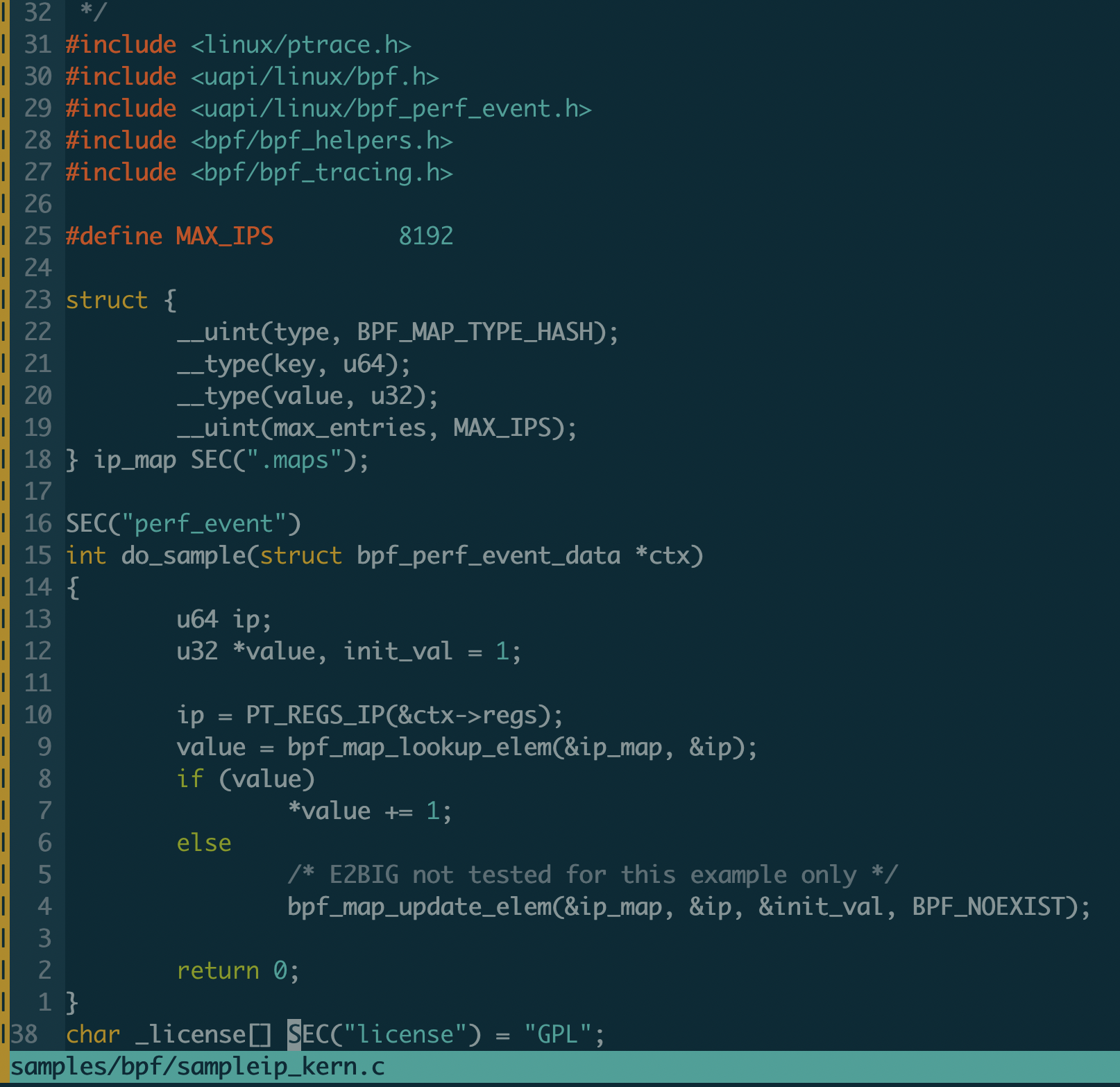 这里我们具体看一个sampleip的eBPF程序,看看eBPF程序是如何编写的