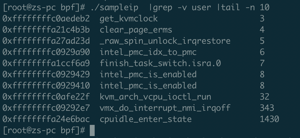 运行内核编译好的sampleip程序,默认是采样5秒,每秒采样99次,程序结束后会把ip_map采集到的信息打印出来。