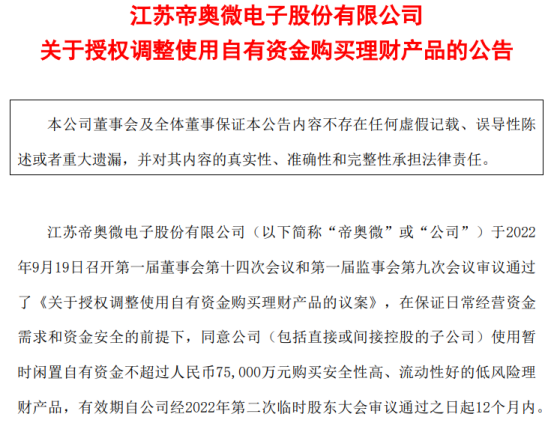 2022年9月19日,帝奥微召开第一届董事会第十四次会议和第一届监事会第九次会议,审议通过了《关于授权调整使用自有资金购买理财产品的议案》,在保证日常经营资金需求和资金安全的前提下,同意公司(包括直接或间接控股的子公司)使用暂时闲置自有资金不超过人民币7.5亿元购买安全性高、流动性好的低风险理财产品,有效期自公司经2022年第二次临时股东大会审议通过之日起12个月内。