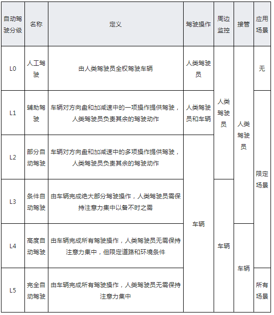 美国汽车工程师学会(SAE)根据自动驾驶汽车智能化程度的不同,将自动驾驶分为了L0~L5共6个等级,体现了自动驾驶技术从驾驶辅助阶段向自动驾驶阶段的过度。
