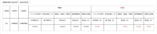 可以看到,调整前,无论是个人工商户还是旗舰店、普通企业店铺,他们在二手奢侈箱包类目的保证金都是10万元。调整后,保证金金额降至5万元。