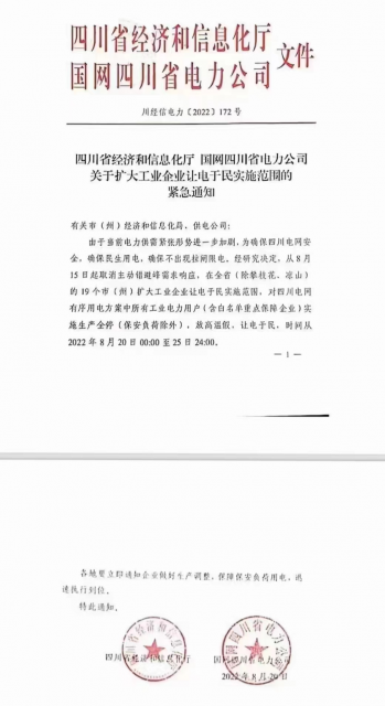 近期,因极端高温天气等原因,四川工业企业“临时限电停产”引发行业高度关注。此前,相关部门曾下发通知,将限电期限定为8月15日至20日。不过,由于高温天气并未得到明显好转,电力供需紧张形势进一步加剧,8月20日,四川经信厅、国网四川电力公司发布的一份《关于扩大工业企业让电于民实施范围的紧急通知》显示,将限电期限延长至25日,使得限电总时长延长到11天。由于四川省是我国中西部集成电路产业重点区域,封测、显示、光伏等领域均遭遇不同程度影响。