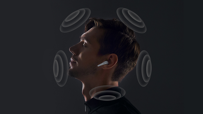 打破普通真无线小耳机声场狭窄、听感不自然的局限,此次 1MORE Aero 采用了自研的实时空间音频技术,将小耳机中的声音释放出来,消除“头中效应 (In-head Effect)”。