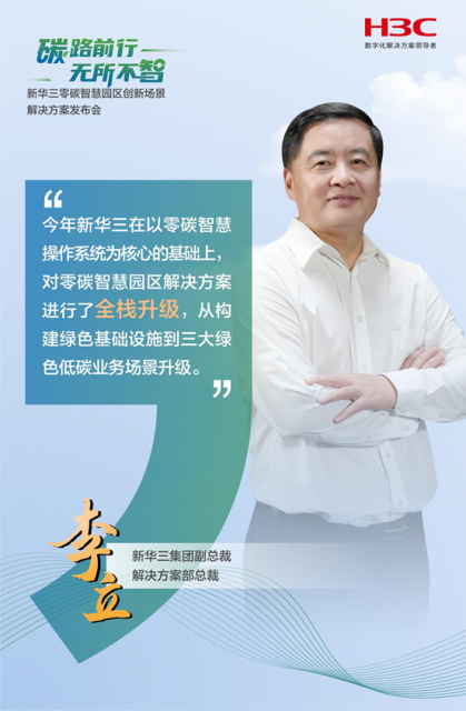 此次新华三集团对零碳智慧园区解决方案的全栈升级,是从构建绿色基础设施到三大绿色低碳业务场景创新。新华三集团副总裁、解决方案部总裁李立介绍,在绿色基础设施升级方面,新华三构建了以数字能源、液冷数据中心、绿色低碳网络等低碳转型的数字底座,使园区微电网支持分布式光伏、组串式储能、充电桩等多项创新,助力园区整体绿色节能;在聚焦场景升级方面,新华三在零碳智慧操作系统上向行业场景纵深升级,形成了产业园区套件、工业园区套件、教育园区套件,三大场景总计沉淀出650+API资产,100+主题/专题模型,370+计算指标。