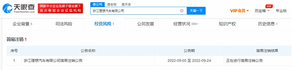 9月14日消息,据天眼查App显示,近日,浙江理想汽车有限公司新增简易注销公告,公告期从9月5日至9月24日。