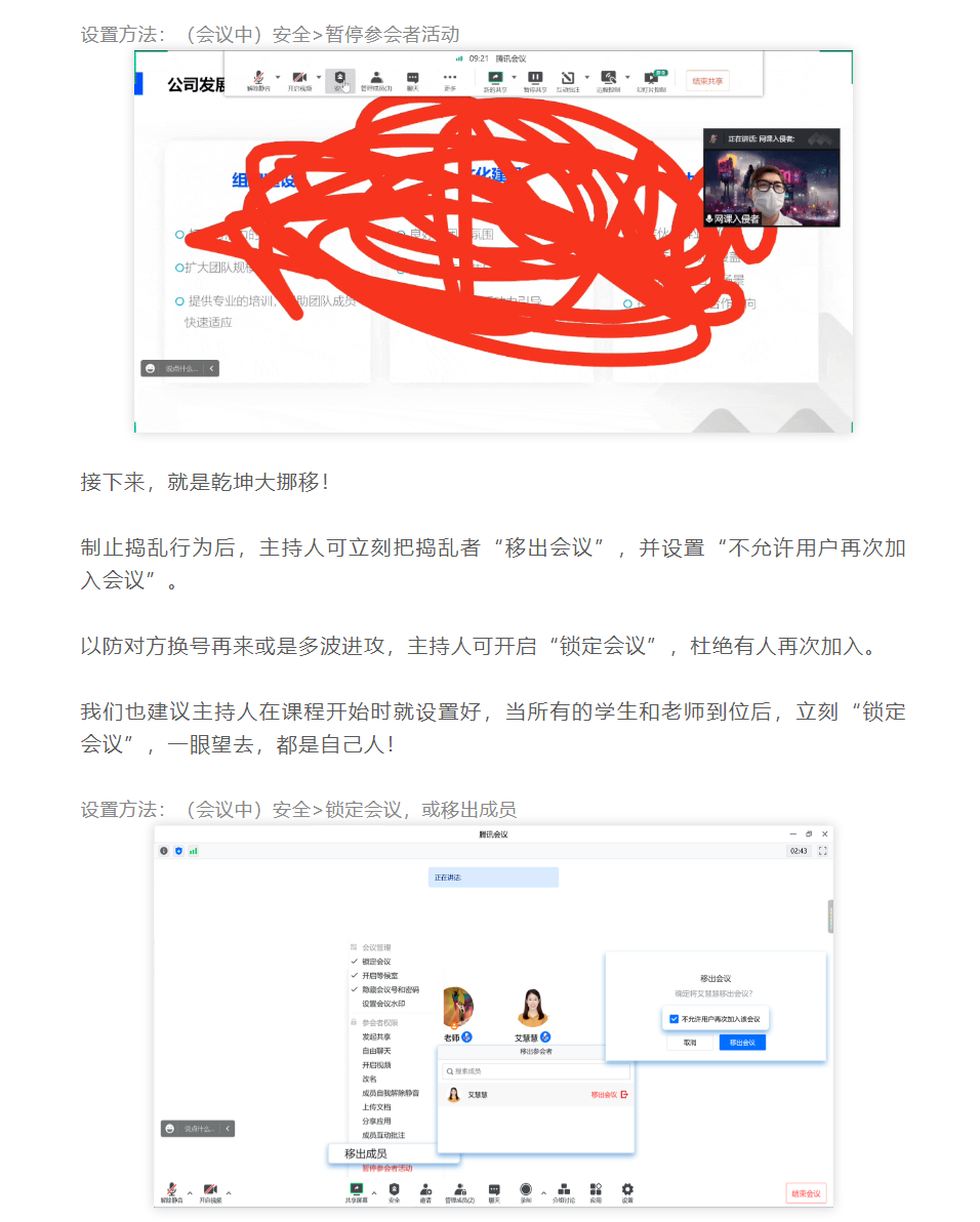 设置方法:(会议中)安全 >; 暂停参会者活动。制止捣乱行为后,主持人可立刻把捣乱者“移出会议”,并设置“不允许用户再次加入会议”。建议主持人在课程开始时就设置好,当所有的学生和老师到位后,立刻“锁定会议”。