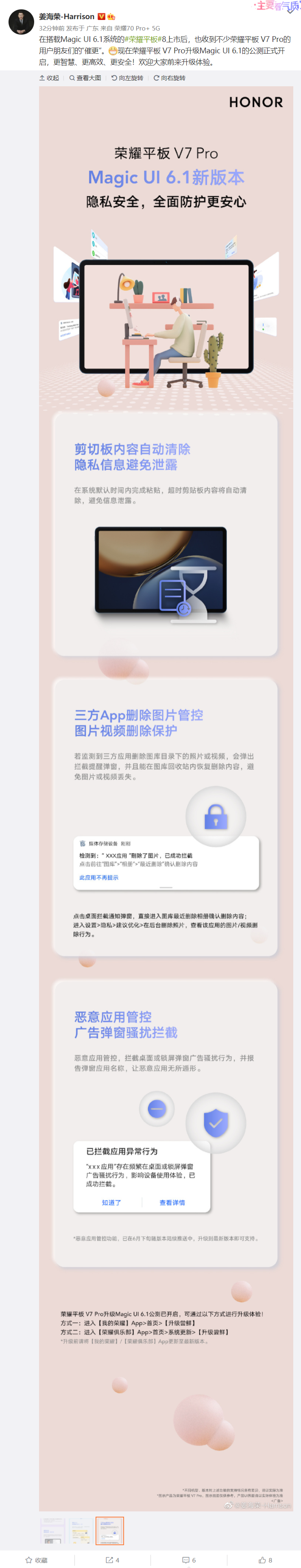 8 月 10 日消息,据荣耀方面宣布,荣耀平板 V7 Pro 升级 Magic UI 6。1 的公测正式开启,更智慧、更高效、更安全。
