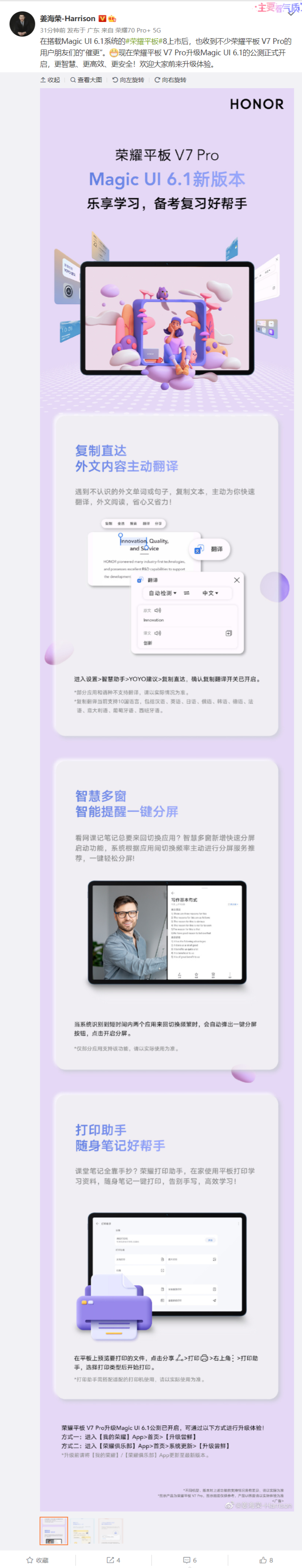 荣耀平板V7Pro开启升级MagicUI6.1公测版:外文内容主动翻译,剪切板内容自动清除...