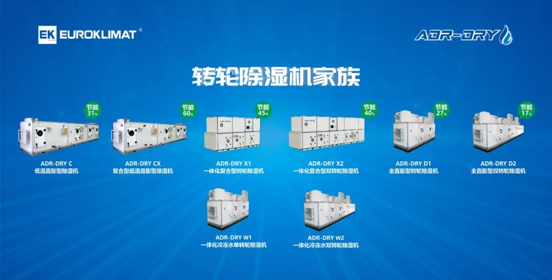 ADR-DRY系列转轮除湿机家族是EK在新能源电池领域除湿解决方案的拳头产品,该系列产品替代了传统冷冻水+单(双)转轮除湿方案,将场景应用与高效节能紧密结合,节能率最高可达60%,有效解决客户锂电车间从拌料制浆、涂布、辊压、切片到注液、封口、组装等各环节生产工艺环境的湿度要求,以及高能耗痛点问题,让电池生产更节能!