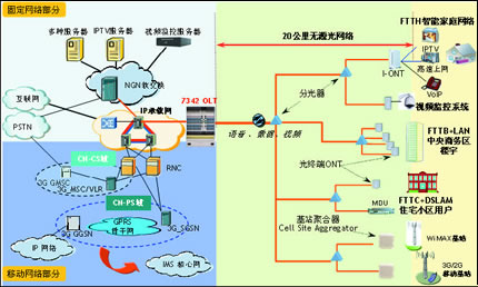 上海贝尔阿尔卡特朗讯的7342ISAMFTTU是一款符合ITU-TG。984标准的电信级的GPON智能多业务接入平台,它的单芯光纤可提供下行2。5G和上行1。25G接入带宽,覆盖范围20公里,支持1∶64的分光比,采用GEM高效封装模式,并提供种类丰富的ONT终端产品。7342ISAMFTTU还包含了基于分组的局端OLT和用户端的ONU/ONT。